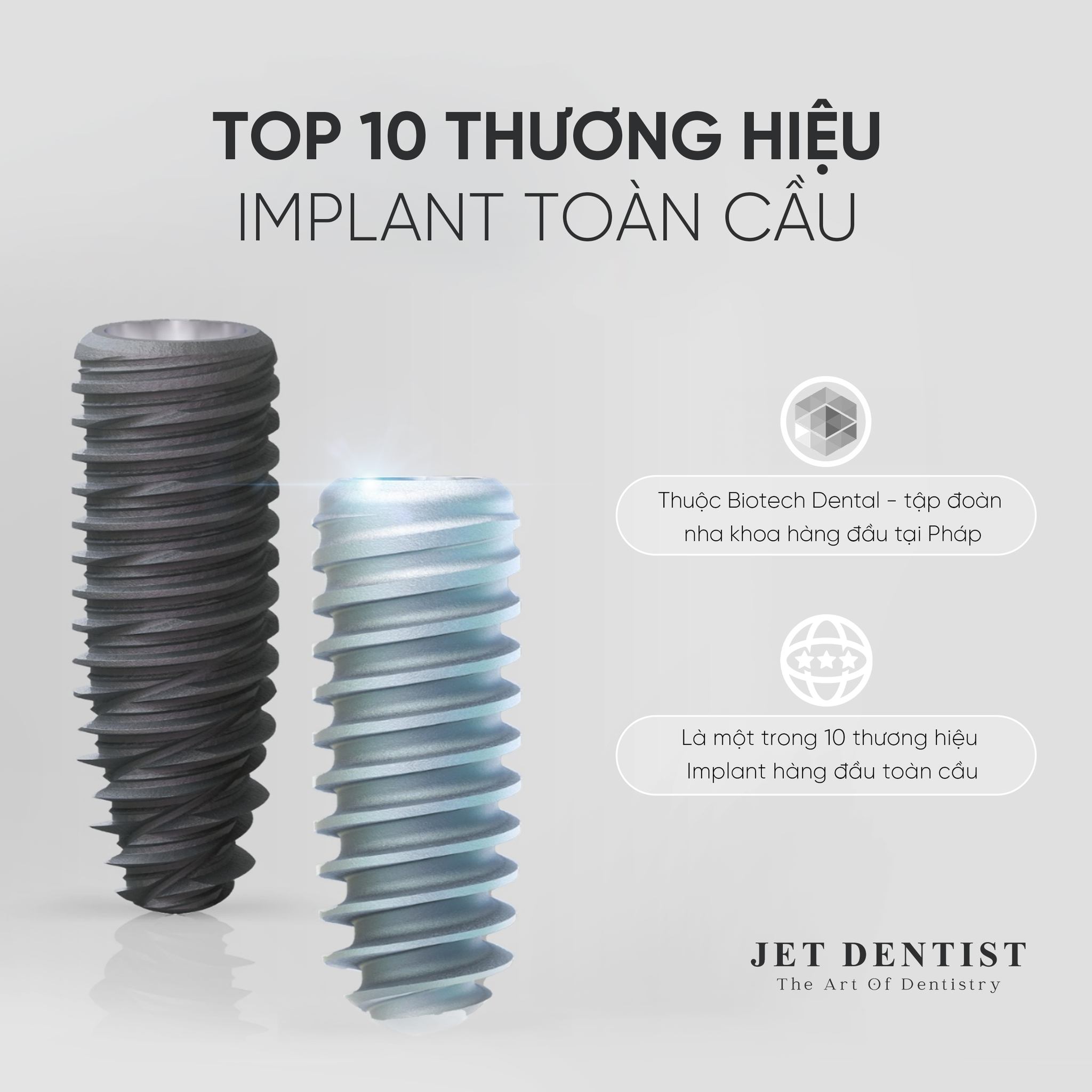 Khi lựa chọn cấy ghép Implant, điều khách hàng quan tâm nhất chính là chất lượng, độ an toàn và độ bền vững theo thời gian. Tại Jet Dentist, những yếu tố đó được đảm bảo tuyệt đối với dòng Implant Kontact – sản phẩm cao cấp đến từ Biotech Dental, thương hiệu nha khoa hàng đầu của Pháp, được tin dùng tại hơn 70 quốc gia trên thế giới.