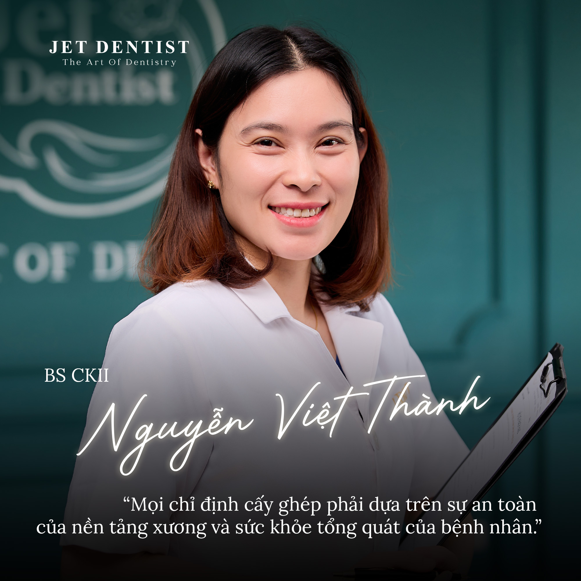 Jet Dentist tự hào có sự đồng hành của Bác sĩ CKII Nguyễn Thị Việt Thành, người giữ vai trò nền tảng trong định hướng chuyên môn Implant. Với học vị Chuyên khoa II – cấp bậc lâm sàng cao nhất hiện nay, bác sĩ Thành nổi bật với khả năng phân tích giải phẫu chính xác, xây dựng phác đồ điều trị chặt chẽ và đặt yếu tố an toàn sinh học lên hàng đầu. Đây chính là “xương sống” giúp các ca Implant tại Jet Dentist luôn đạt độ ổn định lâu dài.