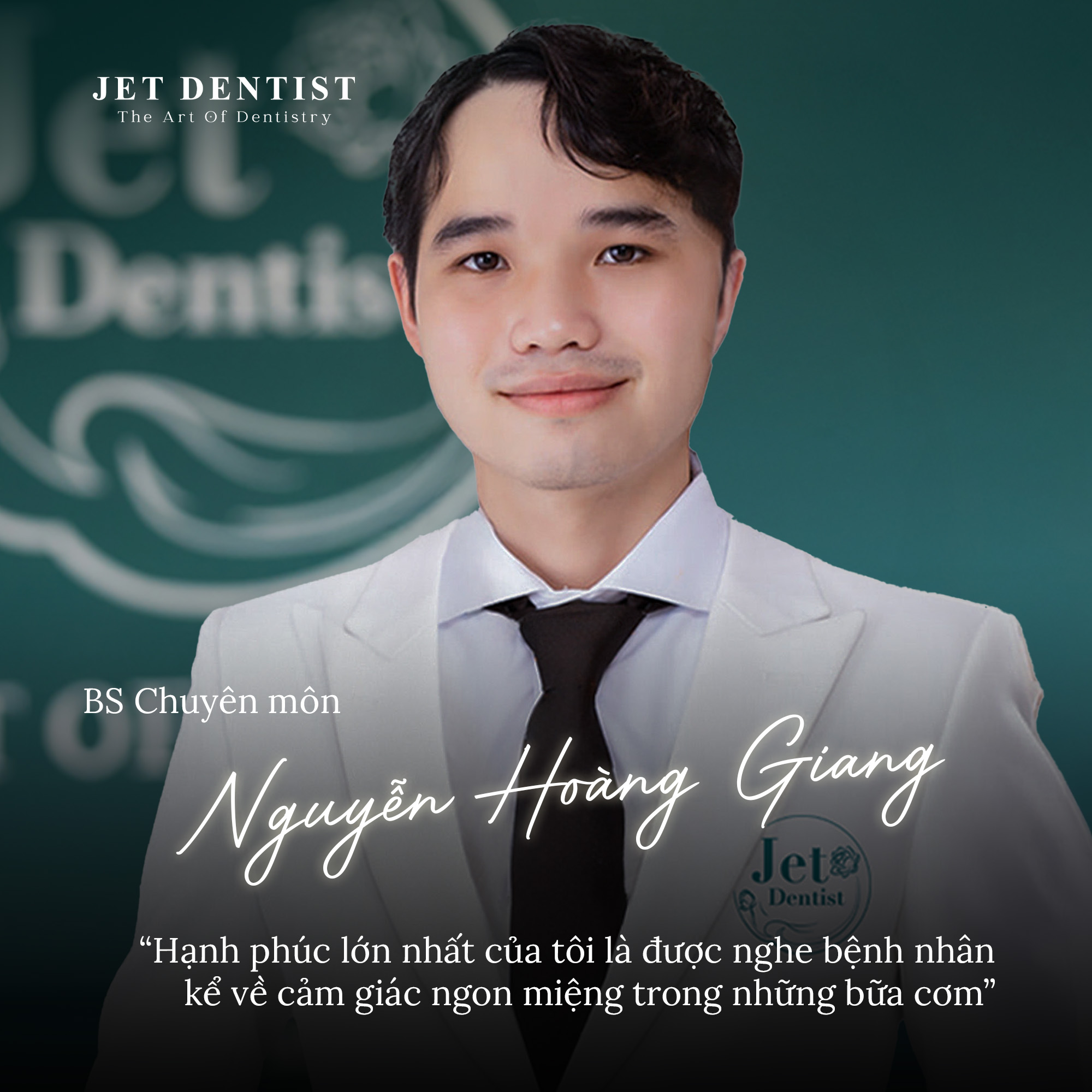 Hoàn thiện bức tranh chuyên môn tiêu biểu năm 2025 tại Jet Dentist là Bác sĩ Nguyễn Hoàng Giang, với thế mạnh ở các ca Implant yêu cầu cao về thẩm mỹ. Từ vị trí đặt trụ, hướng lực ăn nhai đến hình dáng răng phục hình, mọi thao tác đều được thực hiện nhẹ nhàng, tinh tế, đảm bảo sự hài hòa tự nhiên cho nụ cười sau điều trị.