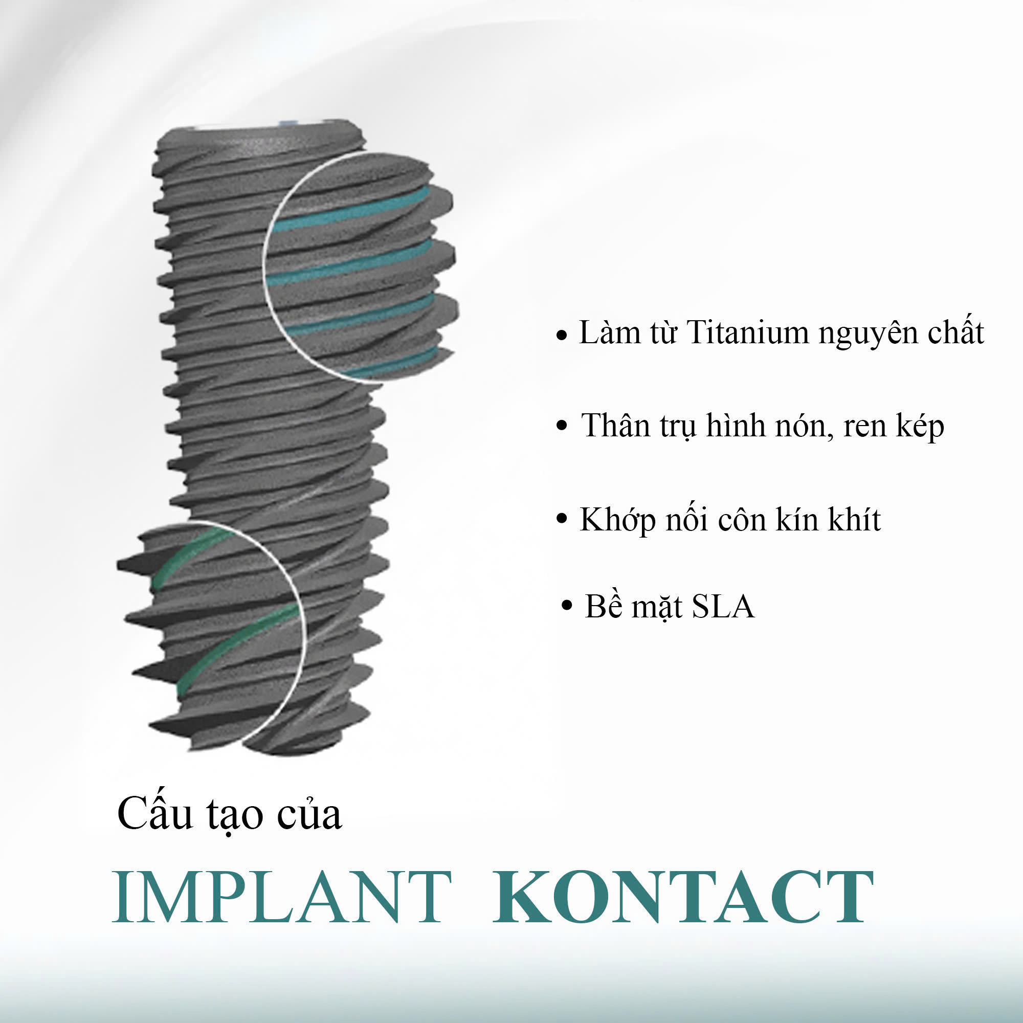 Tích hợp xương thần tốc: Với chất liệu Titanium cấp độ 5 tinh khiết, trụ Kontact Biotech có tính tương thích sinh học cao, giúp rút ngắn thời gian lành thương và bám chắc vào xương hàm.